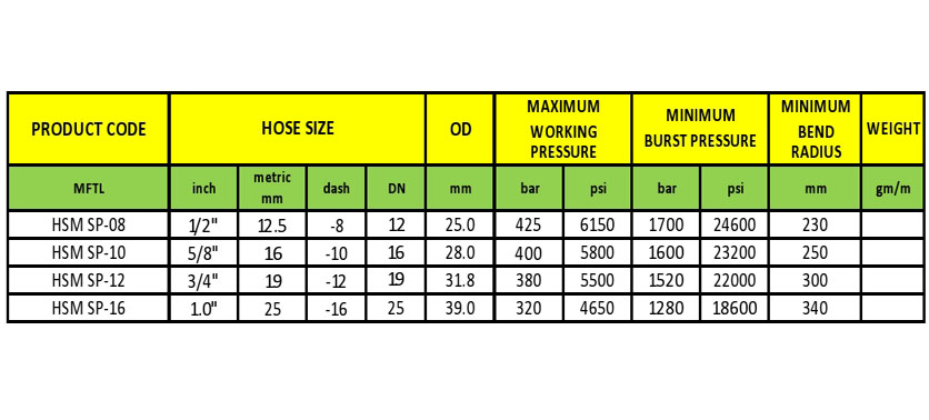 | Construction: | Tube: Oil resistant synthetic rubber blend. Reinforcement: 4Spiral Layer of High Tensile steel wire. Cover: Oil, weather, abrasion resistant synthetic rubber blend. |