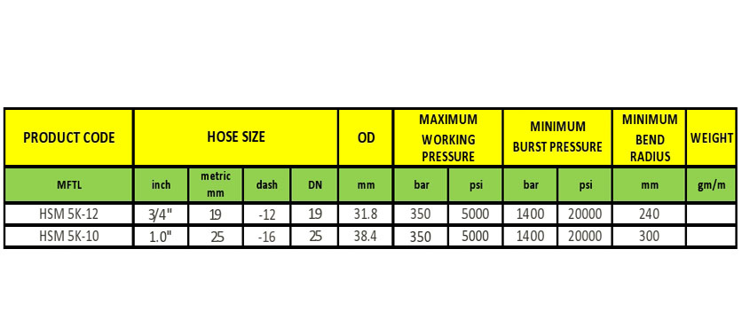 Note: Service temperature in excess of 100 ℃/212℉ and MBR lower than recommendation may materially reduce life of the hose. 1.0 Mpa = 10bar, 1.0 Mpa = 145 psi, 1bar = ~1.0 kg /cm' Bend radius measured at inside of bend.